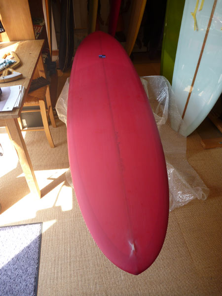 Mさん、8’4”プリモ完成です。カツさんこのプリモ見て、どんなのでも乗れちゃいますよ、とストークしていました。赤いボードいいです。