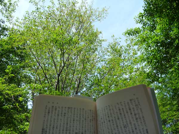 今朝は休息日。風と新緑が気持ちいいので裏山のベンチに寝転んで読書してみました。