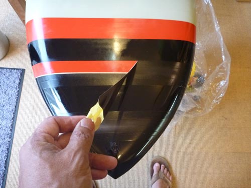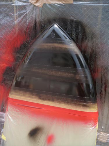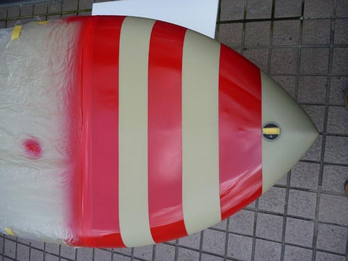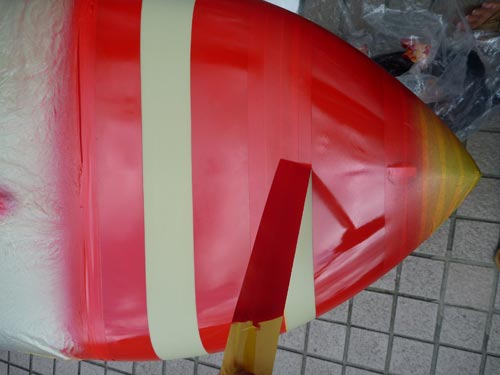 まずは赤をスプレー。マスキングを剥がしていくと縞模様が出てきます。