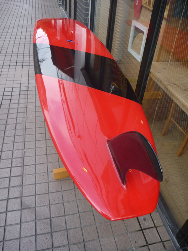 レールもボトムも丸く、グラスオンされたフィンの根元もグラスロービングの曲線。ボトムの水の流れを邪魔するものは何も無く、すべてはスムース。