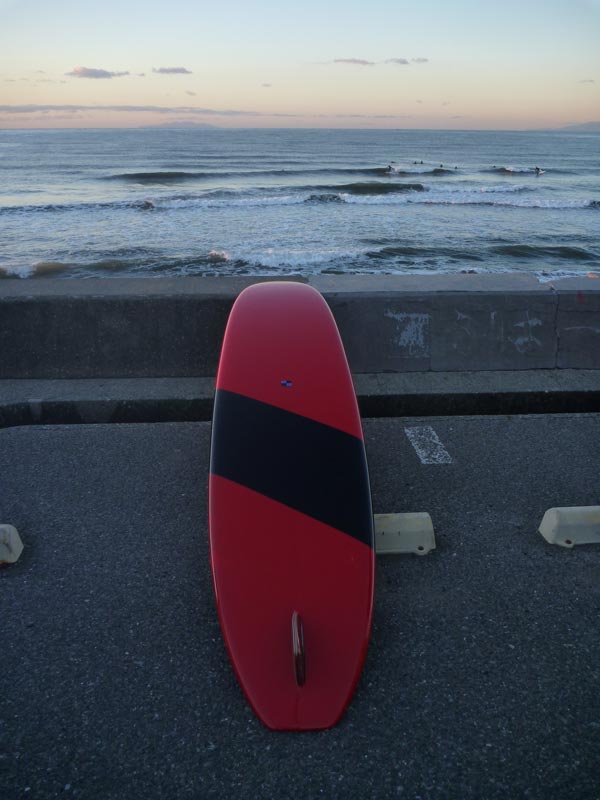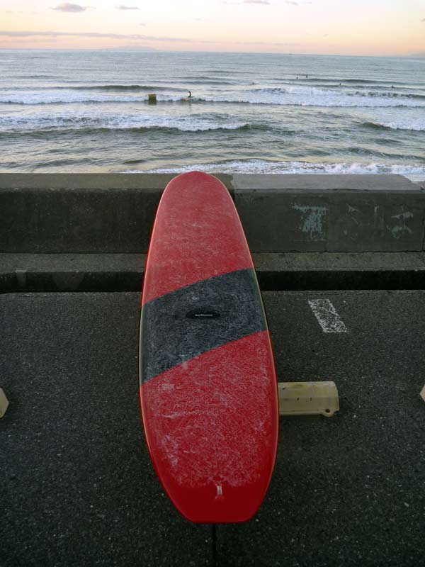 昨日吹いた風が沖でまだ少し残っているようだったので、コシくらいの波で新しいロングボードを試せるかと海へ行ってきました。