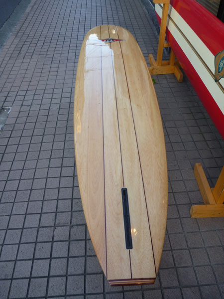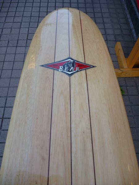 1989年シェイプのBEAR バルサです。ブラシでもなく、木目シートを貼り付けたのもでもなく、リアルバルサのロングボードです。中を抜いてあるようで、ソリッドなウッドボードの重さではありません。