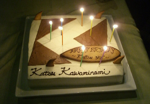 昨夜は茅ヶ崎のスポーティフカフェで川南活さんの、5●歳のお誕生日パーティ。カツさん本人にはパーティ会場に着くまでシークレット、いつものメンツでファミレス行くつもりのカツさんには、サプライズパーティ。なんにも知らないカツさんは、お母さんお手製のおはぎの風呂敷包みを片手にノコノコとやってきたのでした(笑)