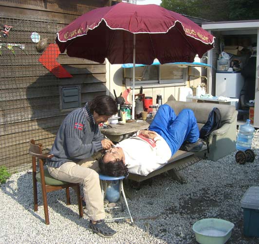 トシキ先生は歯科医師です。逗子からカツさんのシェイプルームまで往診に来ました。カツさんの奥歯をその辺にあったヤスリでサンディング中。トシキ先生は今月末ごろサーフィンをテーマにした小説を出版しますのでみなさん買いましょう。
