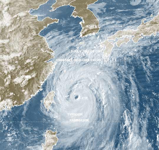 画像は2002年の台風5号。画像のソースはこちら。毎日地球のどこかの画像を一枚づつ紹介しているサイトです。