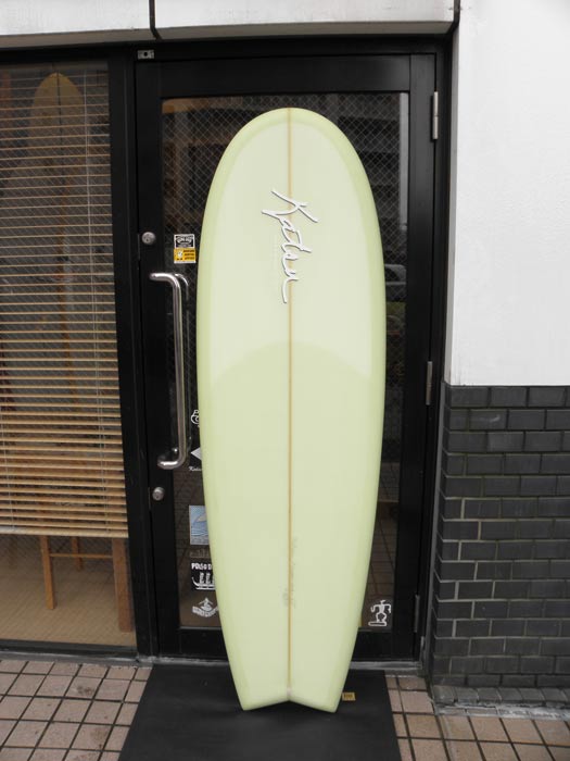 活さんのフィッシュのラインアップには、いわゆるサンディエゴフィッシュと呼ばれる形のフィッシュはありません。KK FISHは調子のいいフィッシュですが、実はこのボードも70年代のリノのツインフィン、つまりBOOGIEを完成させようという過程から生まれてきたものです。