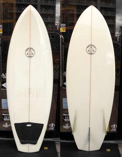 その写真に写っているボードがBUMBLEBEEの原型です。クラシックなフィッシュと同じくらいの幅があるので比較的小さな波から滑ってくれて、波のサイズが上がったとしても、そこはボンザーですからばっちり機能してくれます。