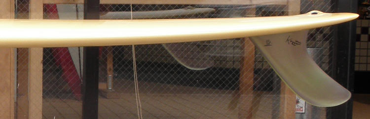 私のログはテールにかけて緩やかにロッカーがはいっていますが、ノーズライダーは途中まで緩やかなロッカーが、テールの近くで急に強くなっています。テールキックと呼んでいますが、ノーズライダーの特長のひとつです。