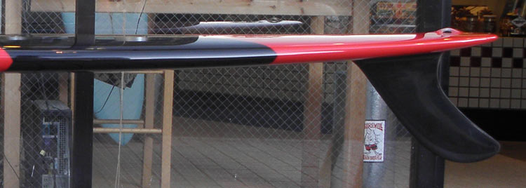 上は私のお気に入りの赤いログ。そして、下はいわゆる「ノーズライダー」と呼ばれるタイプのロングボードのテールです。並べてみると違いがよく分かります。