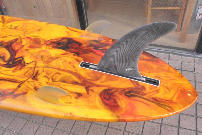 特徴としては、まず目につくラウンドピンテール。そして小さなサイドフィンがついた、シングルスタビライザーのフィンセットアップです。