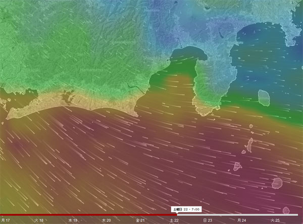 来週はずーっとオンショアの予報。予報通りなら、土曜日には沿岸の風が弱まって結構いいかもです。