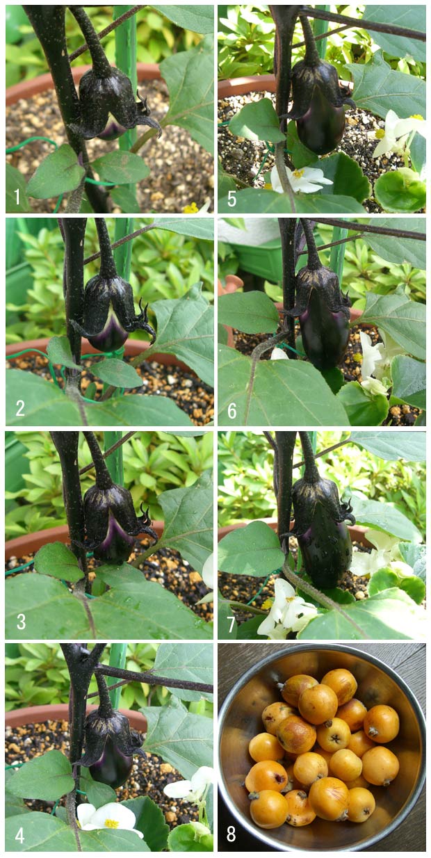 「親の小言とナスビの花は、千にひとつも無駄がない」と申しますが(知らない?)その言葉どおりいつだかにご紹介したナスビの花が実に育ち始めました。一週間ほど前から出かけるまえに撮影した、ナスビの成長シークエンスです。ナスビが日に日に大きくなって行きます。
