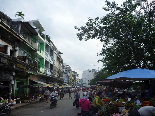 道路は食べのこしや容器のゴミ、それに降った雨がまじった泥の水たまり。それでもその上で売られている果物や野菜はどれも美味しそう。
