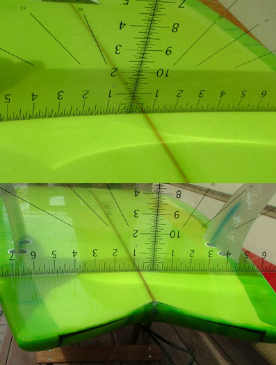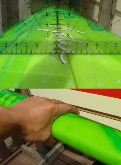 厚みをレールまで落とさず、意識的に厚めのダウンレールにシェイプしています。厚いレールを残して浮力を落とすためにデッキにコンケーブを入れています。これで2”3/4→2”5/8に。センターよりレール寄りの方が厚かったりします。