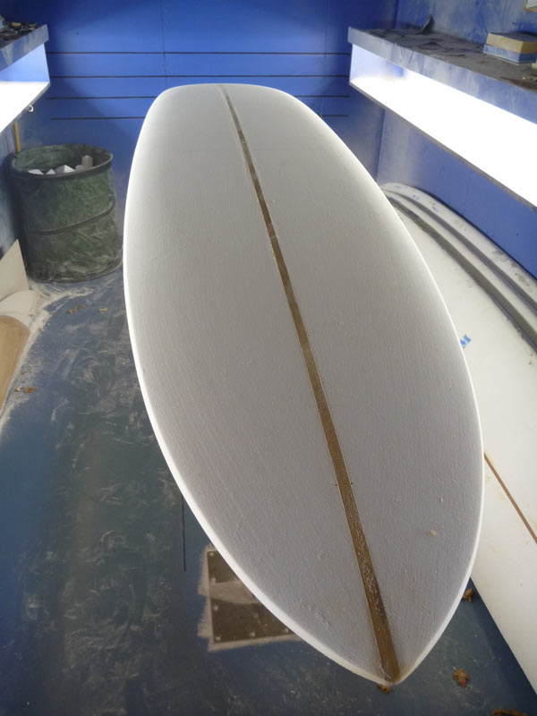 ボードのセンターはフラット。テールのフィンBOXのまわりにだけ緩くVEE(もしくはラウンド)を入れていただきました。レールが軽く上がっているのは、プリモと同じ形です。