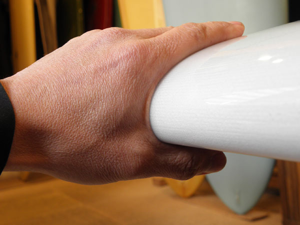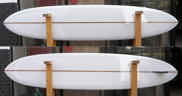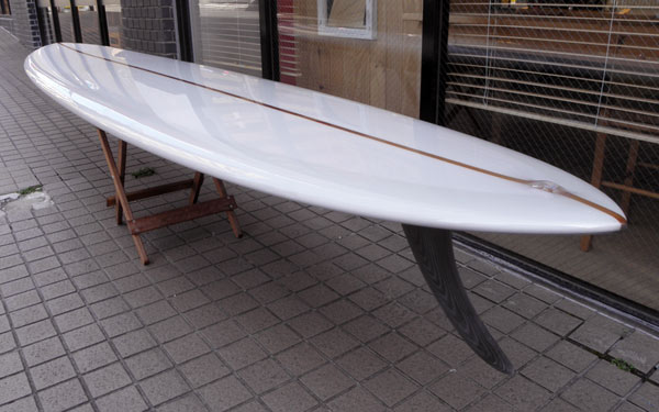これまで何本か作ってきたDフィンのピボット的なコントロールとは違い、ラウンドピンテールとレイクフィン、VEEとレールエッジによって、よりスムースにスピードに乗ってアウトからインサイドまで波を乗り継いでいくことを考えたロングボードです。