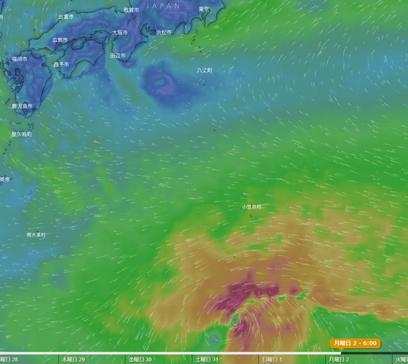 ひとつは、週末にかけて日本のはるか南を足早に抜けていく予報。そしてもうひとつは上の画像(4月2日 午前6時の予報画像です)。ゆっくりとやっぱりちょっと遠いですが、日本の南を通過していく予報。