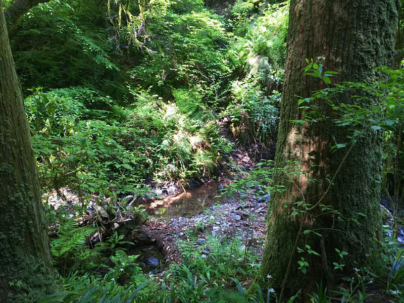 渓流沿いの登山道を樹々の梢を見上げながら登っていきます。乾いた涼しい風が心地いいトレッキングです。