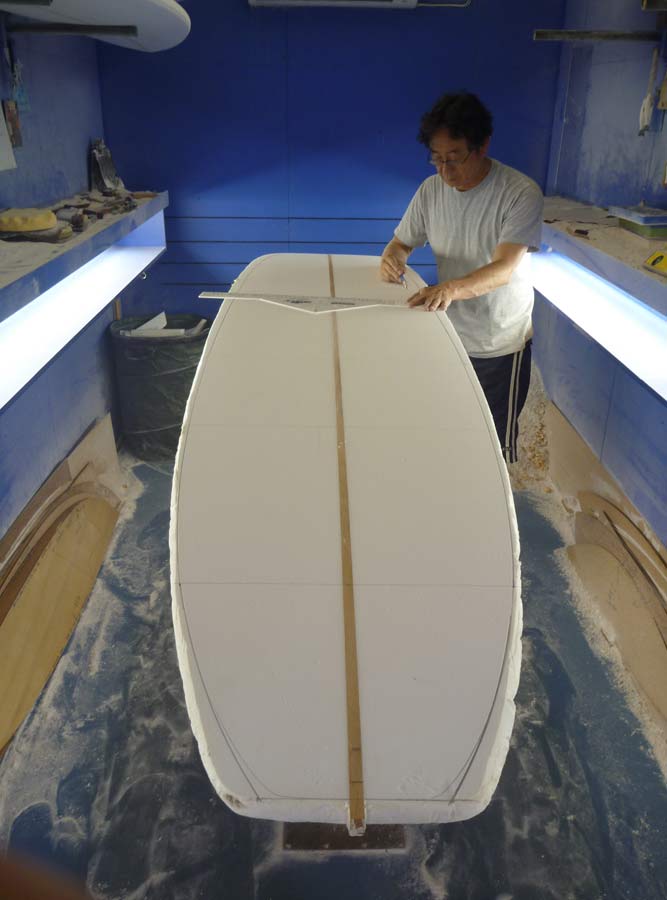 9’9”のブランクスのフルレングスを使ってアウトラインを引きました。9’8”~9’9”くらいです。フルレングスということでサイズは気にせずやっていただいてます。