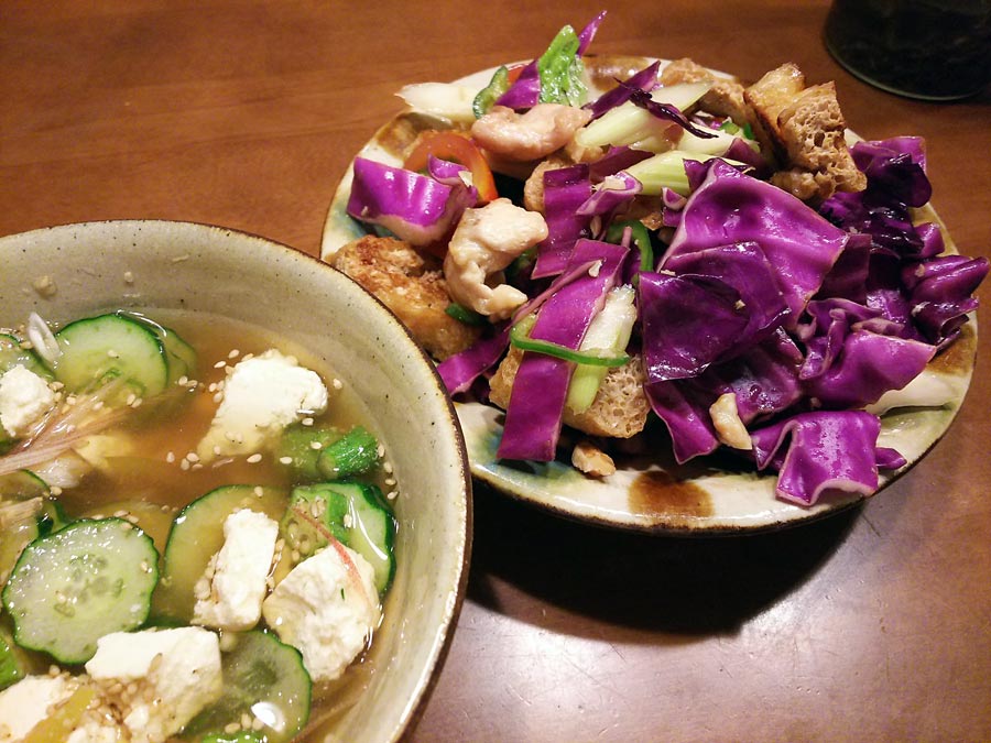 野菜はごま油でトスして、やっぱり梅しょうゆで味をつけたところへ、焼いてから粗熱を取った鶏とお揚げをまぜて、軽く砕いたクルミをのせて完成です。柔らかい紫キャベツの甘味と梅の酸味、お揚げは口に入れるとジュワっと梅しょうゆと鶏肉の味がしみ出してきます。ピーマンとセロリはちょっとだけですが、重要なポイントです。