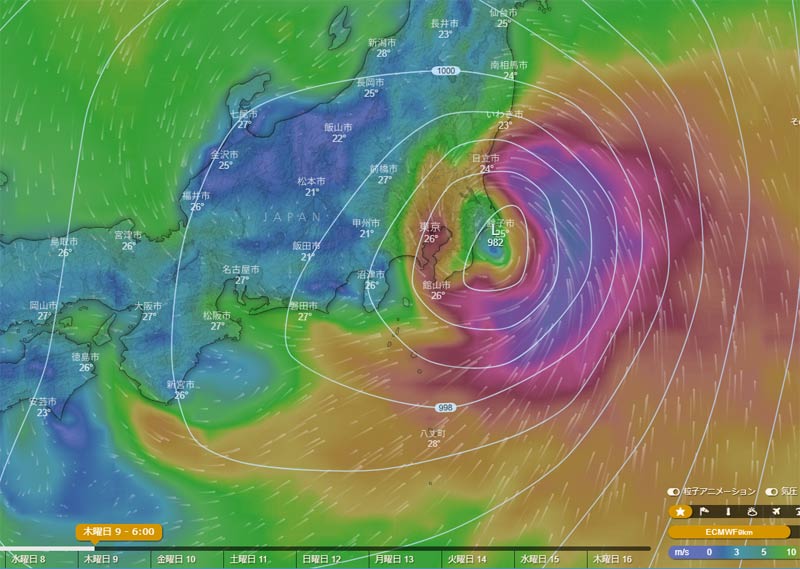 進路は当初の予想よりもだんだんと東へずれてきて、正面上陸はなんとか免れそうな感じです。直撃には近いですが、関東は可航半円側になりそうです。進行方向の右側の危険半円よりは若干風が弱くなります。