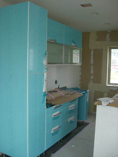 青い保護シートの下はピカピカの白です。なかなか使えそうなキャビネットが出来上がりました。