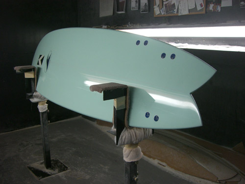 そんなわけで今日は朝からリペアボードのピックアップをかねてカツさんのところへ行ってきました。シェイプルームで見覚えがあるアウトラインでボリュームたっぷりのフィッシュを発見。隠れたヒットモデルの「ソープスリッパー」です。これはP-2のブルーのプラグですね。千葉のテッドさんのショップからのオーダーです。