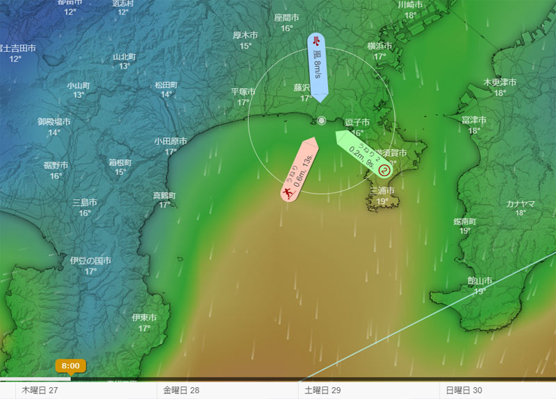 読めない部分は、前線です。沖合いで北の風が強く、沿岸もオフショアが強めに吹くので、カタ・アタマから少しマイナスして考えてちょうど良さそうです。