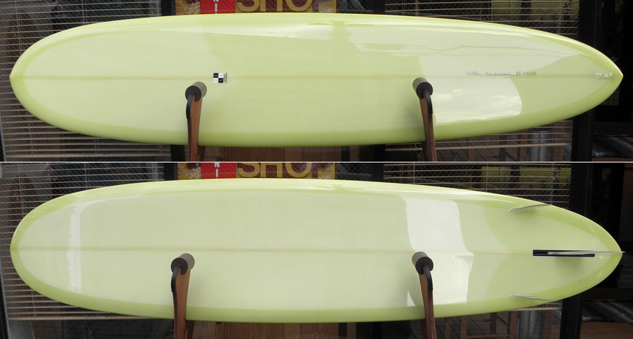 このボトムとレールのデザインは、シングルフィンモデルのPRIMOも同様です。自分でもお気に入りの8’4”のPRIMOも同じボトムとレールの形状をしています。