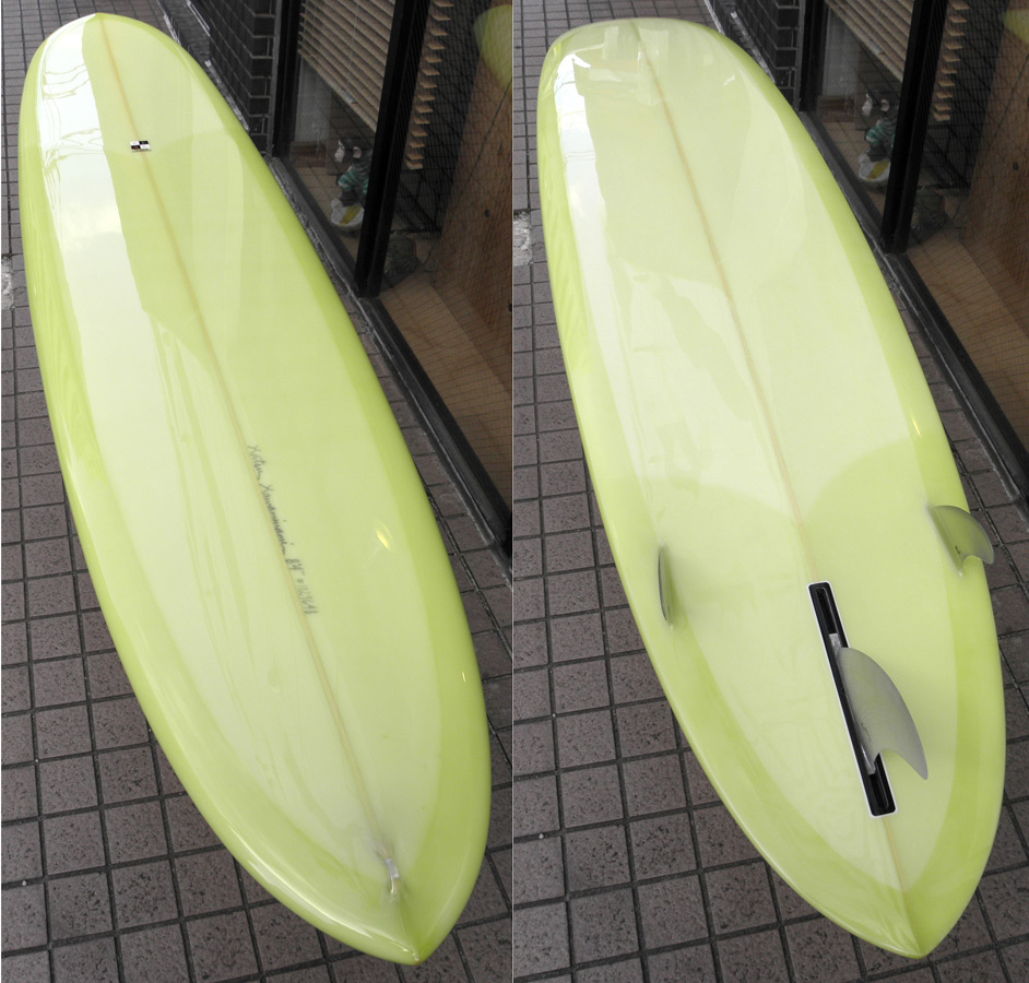 8フィート4インチ、TIKI(ティキ)モデルが出来上がりました。カツカワミナミサーフボードはオーダーをいただいて作ることが多いのですが、それぞれのモデルがどんなボードなのか、実際に触っていただけるように店頭用のボードです。もちろん気に入っていただければ、その場でお持ち帰りもOKです。