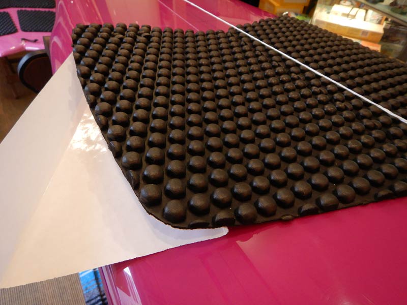 今日のお楽しみは、パッド貼り。おニューのニーボードのデッキにヒザ立ちで乗って滑らないように、ヒザが痛くないようにパッドを貼り付けます。