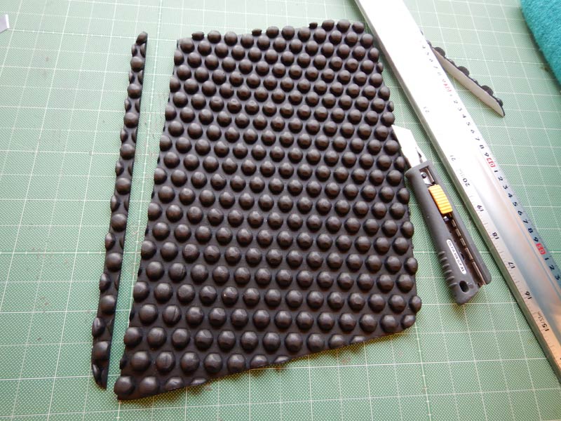 このラインを中心にパッドを貼るのですが、そのまま貼るとこのパッド、幅が広すぎてレールからパッドがはみ出す勢いなので、切って幅を調節します。このボードで23インチ近くありますから、オーストラリアのニーボードの幅広さが分かるというものです。