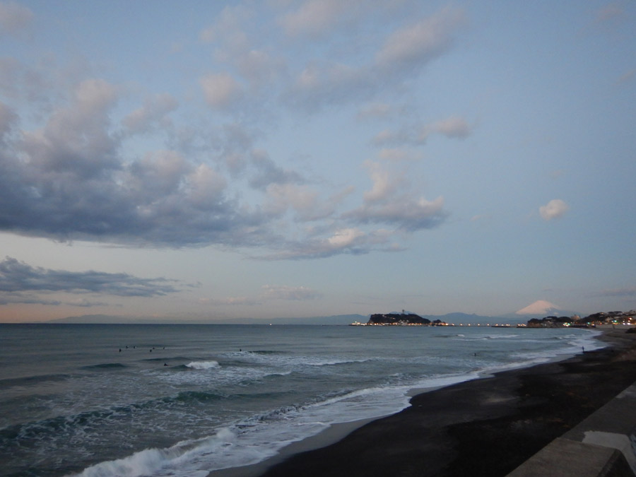 午前6時半。ようやく明るくなった海です。太陽はまだもう少し。画像では分かりませんが、富士山の後ろの空がピンク色で、雪で真っ白になった富士山とのコントラストに寒いのも忘れて見とれてしまいました。冬はそんな楽しみもあります。