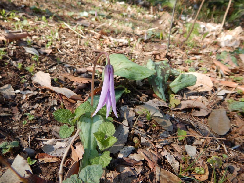 日当たりがいい斜面にはカタクリの花がぽつりぽつりと咲いています。もうすぐ細長い花びらがクルリと反ってきます。