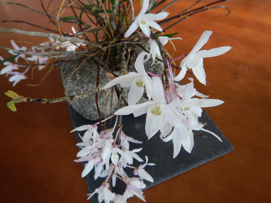 もうひとつは、セッコク。これも着生ランのなかま。形はやっぱり変わってますが、花が咲いているときだけは華やかです。いい香りがします。