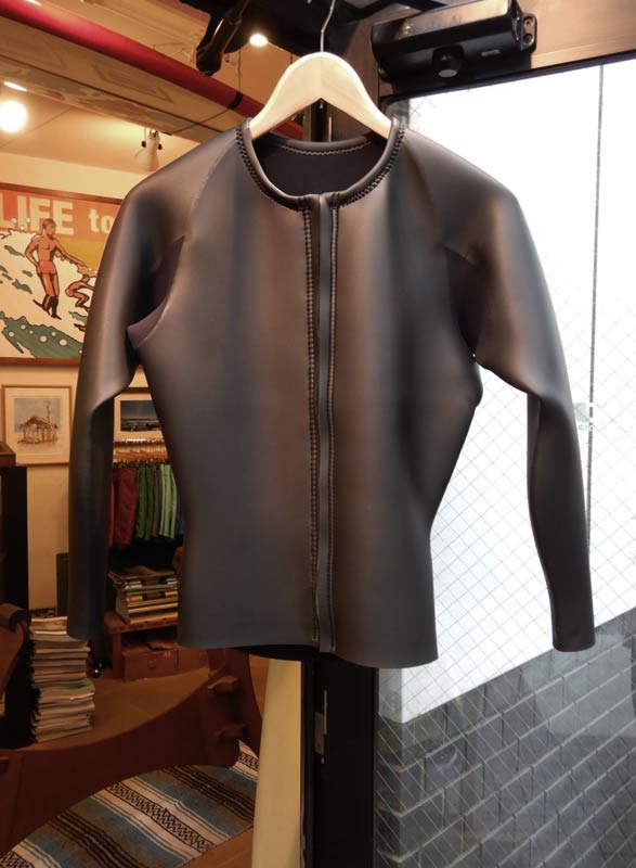 こちらはジャケットとショートジョンのセットアップ。ロンスプ仕様は今日みたいな雨の日にちょうど良いと思います。ジャケットのエリは少し高め。この方はフルスーツのネックも高めというリクエストで古くから愛用いただいています。そんなオーダーも可能です。