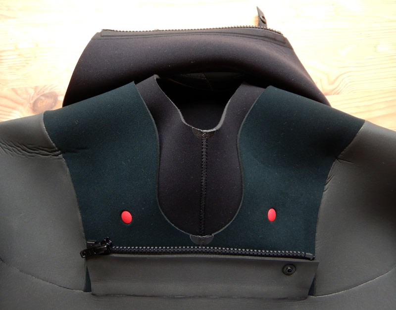 首回りはきれいにフィットしますので、海水の侵入は少なそうです。さらに海水を入りにくくする折返しネックのオプションもあります。
