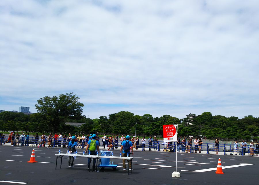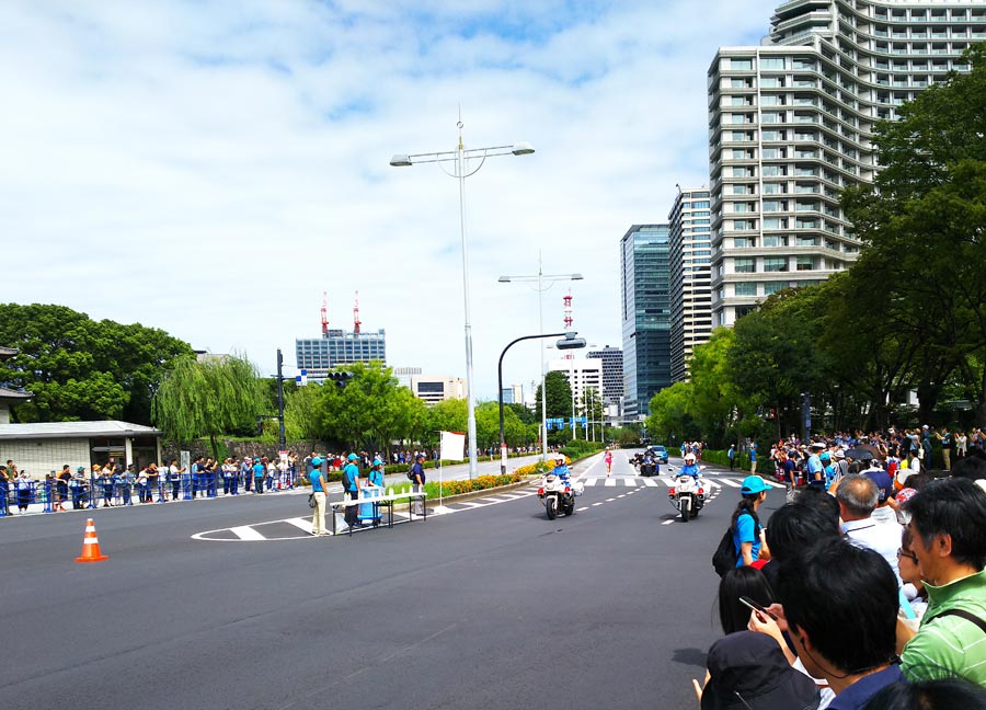 コース的には銀座、日本橋を芝公園まで往復してきた選手たちが靖国通りから内堀通りへ入って、二重橋で折返し、また靖国通り方向へ戻っていく、30kmと35km地点の中間付近です。