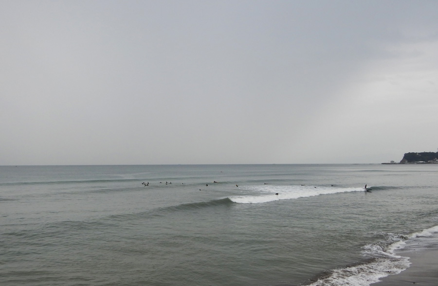 雨とオフショアですっかり肌寒い朝。波は、コシ・ハラ。サイズは落ちてしまいましたが、面がきれいな波です。