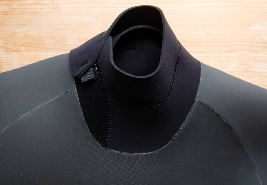 新しいバックジップのオートジップシステムは革新的だと思います。背中のジッパーが柔らかくなってパドルは軽いですし、首回りの改良で浸水は劇的と言えるほど減っています。画像はオートジップの首回りです。