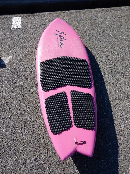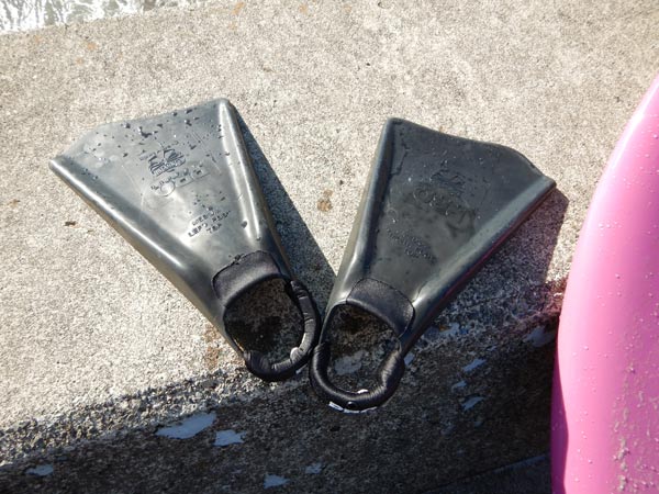 ひとしきり乗ったあとは、これもやっぱり大好きなニーボード。先日、先っぽを切ったフィンを試してみました。