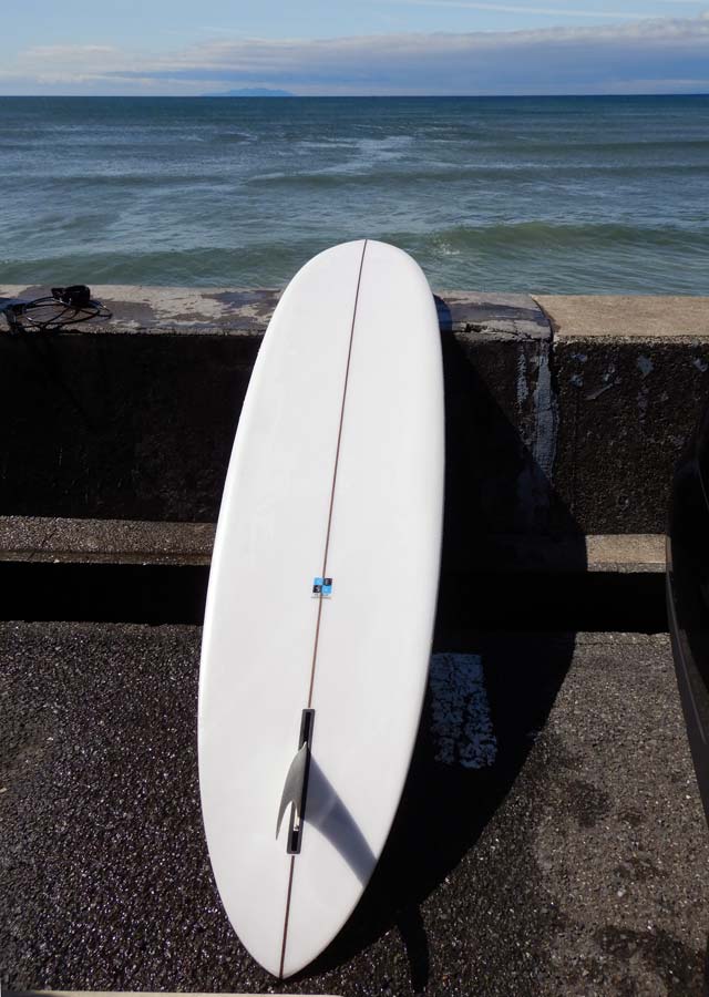 サイズは、6’0 x 21”1/2 x 2”3/4くらい。もう少し長く厚くしてもいいかもです。波のサイズはヒザ・コシ~ムネくらいが楽しいです。緩い波、小さい波でも滑り出し速いし、ルース気味で軽く動いてくれて面白かった記憶がたっぷりあります。