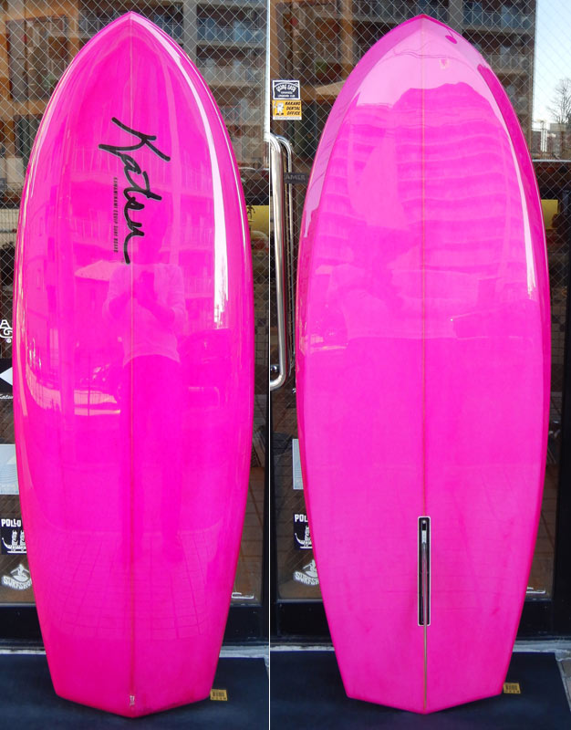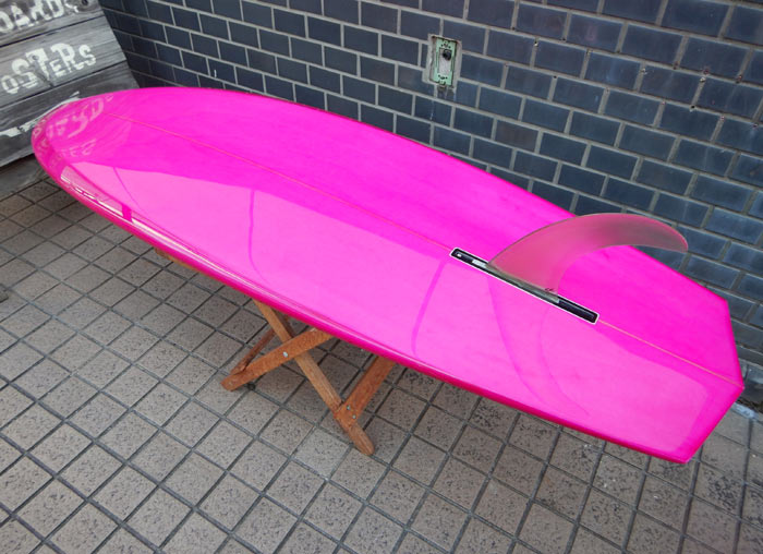 私のニューボードが出来上がりました。ラズベリーカラーのシングルフィン。ニーボードです。