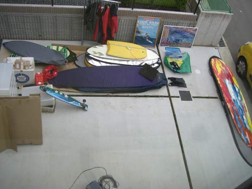 とりあえずガレージに突っ込んであるボードを出して…。ガレージセール状態です。