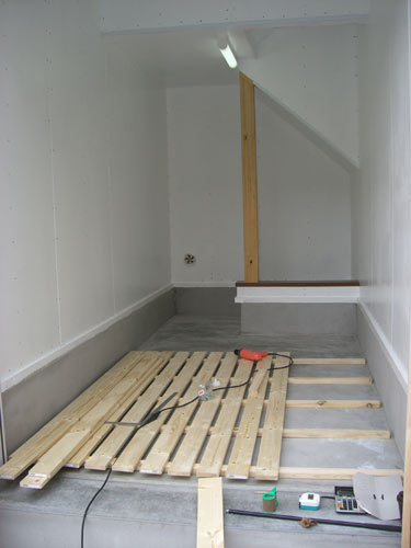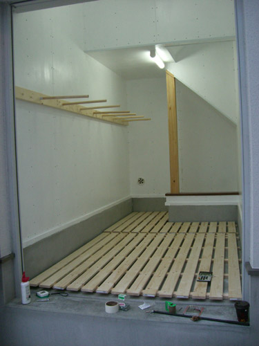 湿気がこもりそうなので床にスノコを組んで行きます。壁のペンキも自分で塗りました。