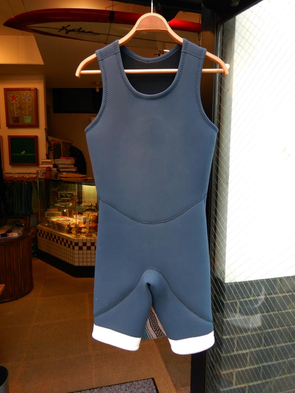 袖にストライプを入れたり、ロングジョン(ショートジョンでも)の胸にカラージャージを使ったり、いろいろできます。私はこんなショートジョンを作ってもらいました。そういえば、ちょっと前にウェットパンツも作りました。