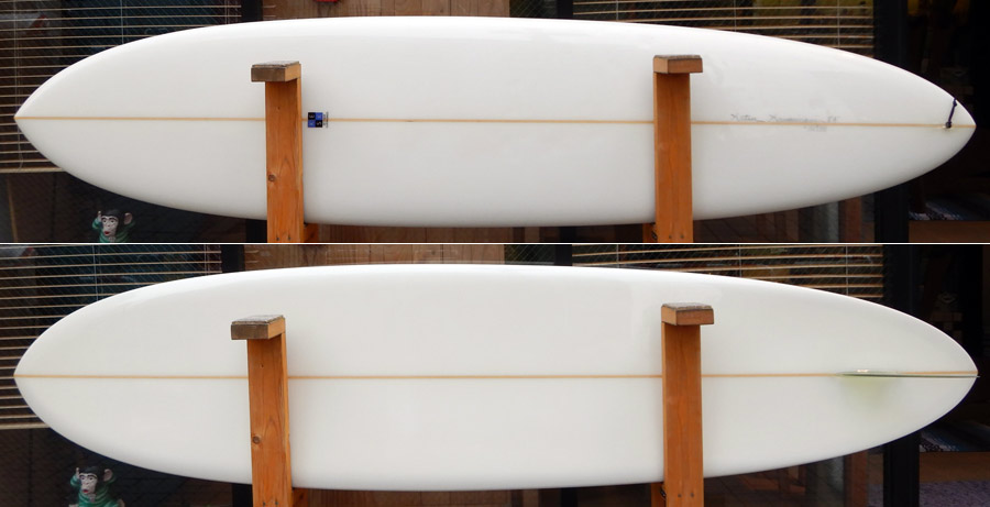最近お気に入りの8.0のロングフィッシュはまた違うブランクスを使います。同じ8.0のプリモとは、ボリュームのバランスやロッカーは全く違うものです。ロングフィッシュはツインらしいバランスで、プリモはシングルフィンのバランスです。