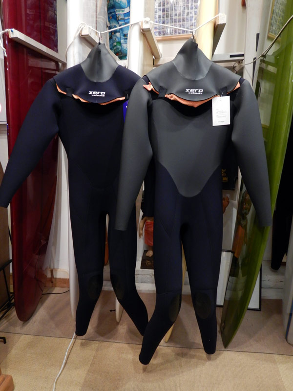 今日の入荷はZEROのエアドームです。AXXE CLASSICのU-ZIPと人気を二分している(ちと、大げさか)モデルです。左側はオールジャージの5/3ミリ。ジャージは表面に水を含むので、風が吹くとスキンよりも若干涼しくなりますが、より柔軟性があって耐久性があります(スキンも長持ちしますよというのは、5シーズン着た私の感想です。涼しくなる分はインナーで調節すれば良いかと思います)。
