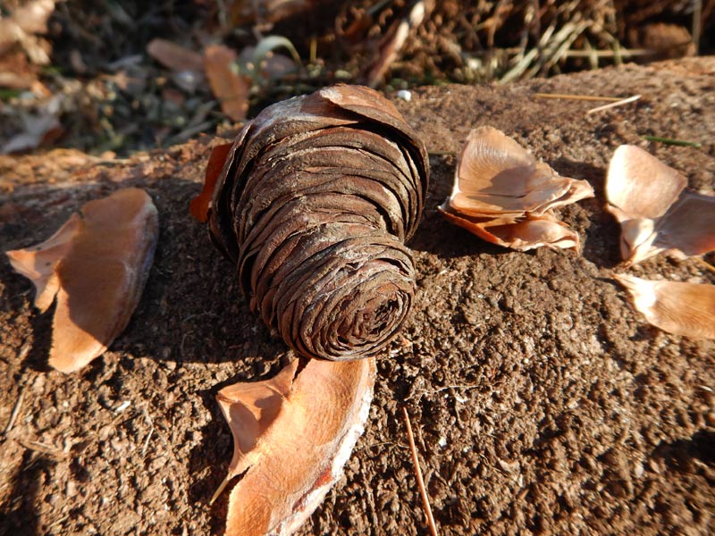 ヒマラヤ杉の実、でかいです。赤ちゃんの頭の大きさくらいあります。これが松ぼっくりみたいに開いて、根本からバラバラに外れた先端がバラの花のように残ります。