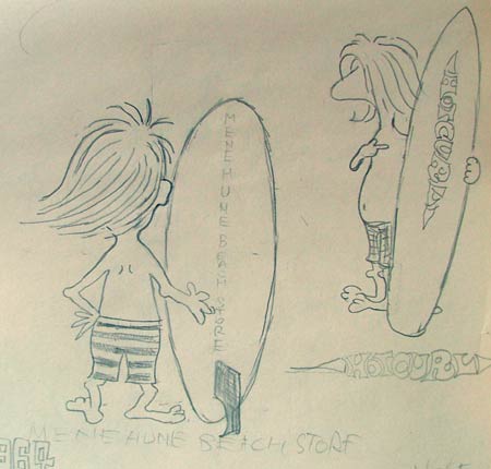 この男の子のサーファーのマークどこから来たんたんだっけ?と古いスケッチブックをめくってみるとありました。モチーフはグレッグ・ノールのパイプラインの写真(笑)大波を前にビーチに立つGNとガンをグロメッツ風に描いたのがこの子です。この落書きに店名のロゴマークを組み合わせたのが今使っている店のロゴマークです。